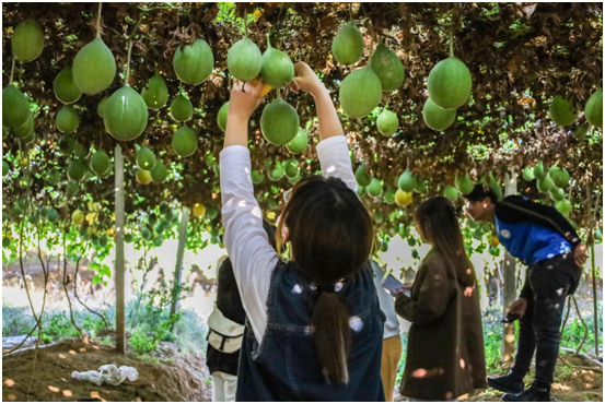 “表皮呈黄色并且开始变软的瓜蒌才符合采摘的条件。”高松村村委会副主任涂敏向大家介绍瓜蒌成熟的标志,同时亲身示范了采摘瓜蒌的具体方法。据涂敏介绍,瓜蒌具有清肺止咳、宽胸散结的功效,是当地百姓增收致富的“金果子”。他表示,员工们的到来,给瓜田里带来了年轻活力,帮助瓜农们推进了采收瓜蒌的“任务额度”。