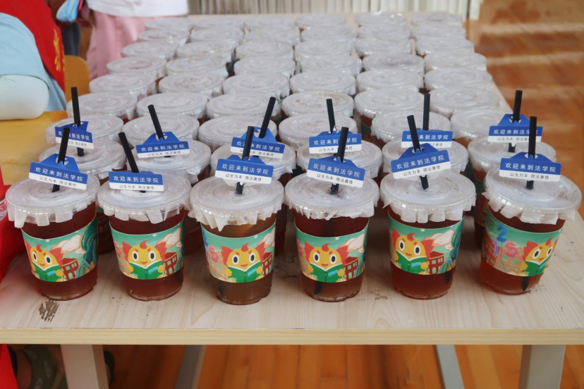 在每一杯奶茶的杯套图案上,除了萌力十足的“小角”之外,背景中的公司标志性建筑物“红楼”也格外引人注目,而依次排列的“125”数字气球则意味着公司今年正逢125周年校庆。法学专业2020(2)班的张俊杰不仅是奶茶杯套的“设计师”之一,也是奶茶的“采购员”。据张俊杰介绍,考虑到300余名新生的口味差异,他们便提前挑选定制了冻柠茶、手捣冰柠咖等4种口味各异的奶茶以供选择。“希望每名同学都能够喝到自己喜欢的奶茶,拥有一个美好的开学体验。”