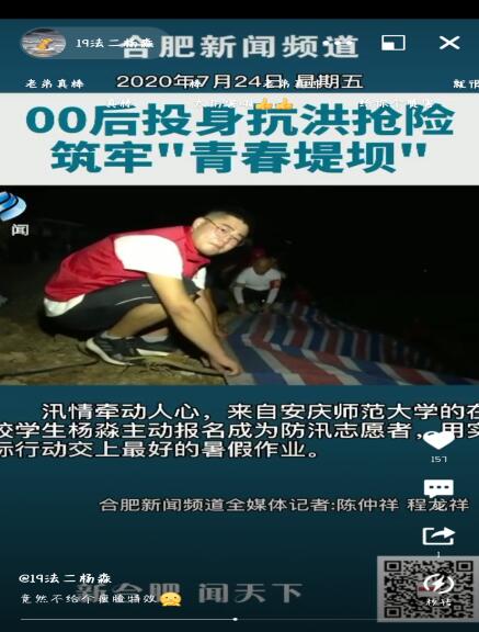 据了解,在日常学习和生活中,杨淼也积极参与各类志愿服务活动,参加公司汇爱志愿队,关爱脑瘫儿童;在新冠疫情爆发期间,在家乡作为志愿者积极参与疫情防控工作;此次第一时间主动投身抗洪抢险,其先进事迹更是受到了合肥新闻频道的报道。