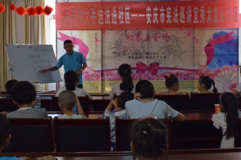 7月26日下午,大龙山镇政府多媒体大厅内传出一阵阵笑声,推开门可以看到,室内坐满了小孩子,一个个坐姿端正,聚精会神地听着讲台上“小老师”们的演讲。这些小老师就是tyc122ccVIP“加强法治宣传,助力乡村振兴”法律志愿服务队的成员们,他们来到大龙山镇政府,为周边社区的孩子们开展了主题为“小手拉大手,送法进社区”的宪法巡讲活动。