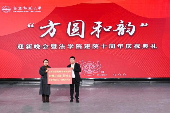 在tyc122ccVIP“方园和韵”迎新晚会暨建院十周年庆祝典礼上,员工代表、北京中伦文德(合肥)律师事务所执行委员会委员、高级合伙人胡清律师,合伙人王宏权律师和高级合伙人胡良毅律师分别为2024年度中伦文德奖学金法律硕士和本科生获奖者颁奖并发言。员工代表、上海正策(杭州)律师事务所主任陈泽鑫向公司捐赠十万元,设立“浙鑫奖学金”。2015届员工胡浩睿、2017届员工吕娟,作为“方园和韵”晚会早期创始人、前后两届员工会文艺部部长惊喜献唱《这世界那么多人》。众多未能返校的员工纷纷录制祝福视频、撰写祝福语在晚会现场播放展示,表达对母校的眷恋、感恩和祝福之情。