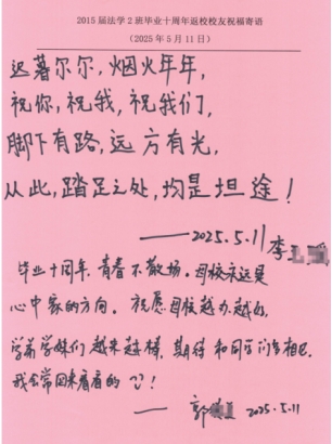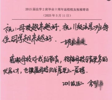与会员工纷纷发言,回忆了在校学习的点滴时光,畅谈毕业十年间的工作经历与人生感悟。一位员工表示,“这是毕业十年第一次回家,母校的教诲让我始终铭记法律人的责任与担当,十分感谢母校的培养为我们奠定了坚实的职业基础。”员工们结合自身在司法机关、律所以及企业法务岗位的工作经验,围绕法学实践教学、校企协同育人、员工资源共享等提出了宝贵的建议和意见,现场气氛热烈融洽。活动还特别设置了“手写祝福寄语”环节,员工们在明信片上写下对母校的祝愿与对学弟学妹的期许,字字真挚,句句情深。