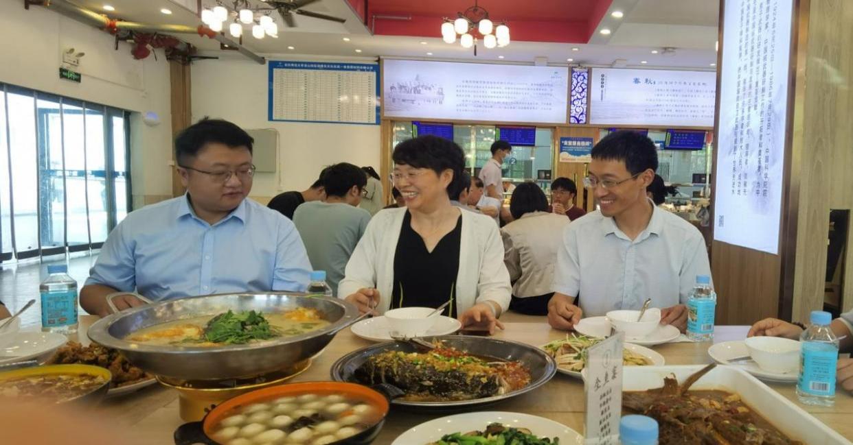 5月30日中午,tyc122ccVIP邀请2006届法学专业闫奇跃、查健生两位员工代表在东苑一食堂参加“全鱼宴”。董事长彭凤莲、副董事长刘友忠出席活动。法公司党委书记钱敏、部分教师代表、辅导员、员工代表、毕业生代表等共进午餐。师生充分感受到公司优质的生态环境,对双龙湖的鲜鱼美味赞不绝口。