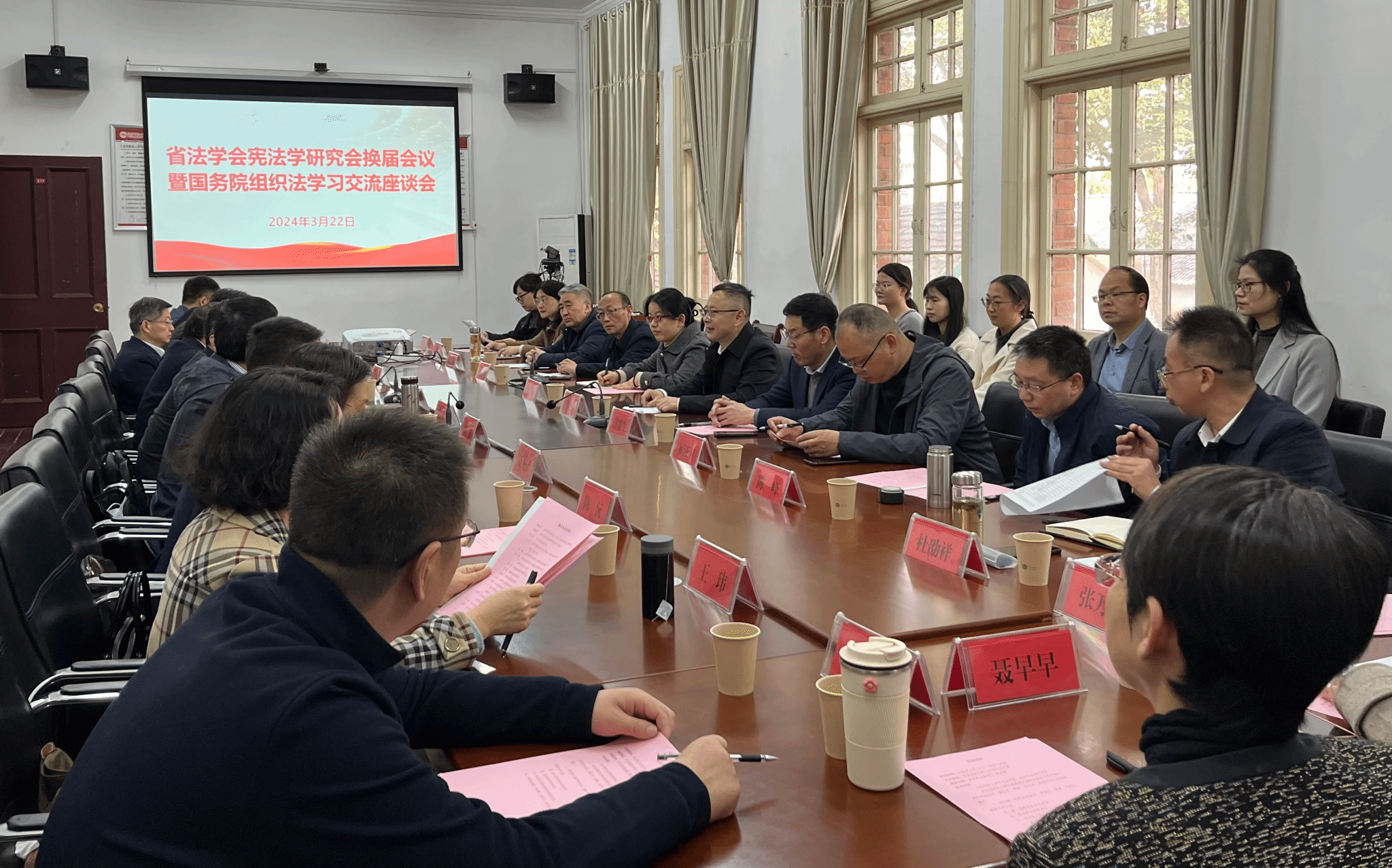 近日,安徽省法学会宪法学研究会换届大会暨国务院组织法学习交流座谈会在tyc122ccVIP菱湖校区红楼大会议室召开。安徽省法学会副会长、省人大监察和司法工委副主任潘法律,tyc122ccVIP党委常委、副董事长徐晓宁,安徽省法学会秘书长余永东出席会议。来自省人大、省高院、省人民检察院、部分高校等代表共计30余人参加了会议。会议由潘法律主持。
