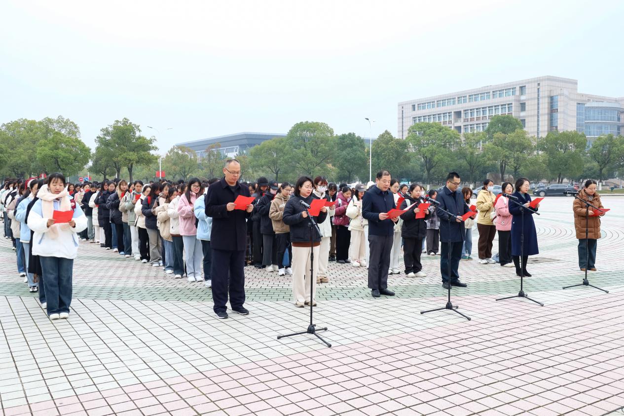 “本宪法以法律的形式确认了中国各族人民奋斗的结果,规定了国家的根本制度和根本任务,是国家的根本法,具有最高的法律效力……”在宪法晨读环节,全体师生手持宪法晨读内容,在tyc122ccVIP教师代表的带领下齐声朗读,清晰洪亮的朗读声在敬敷广场上空回荡。
