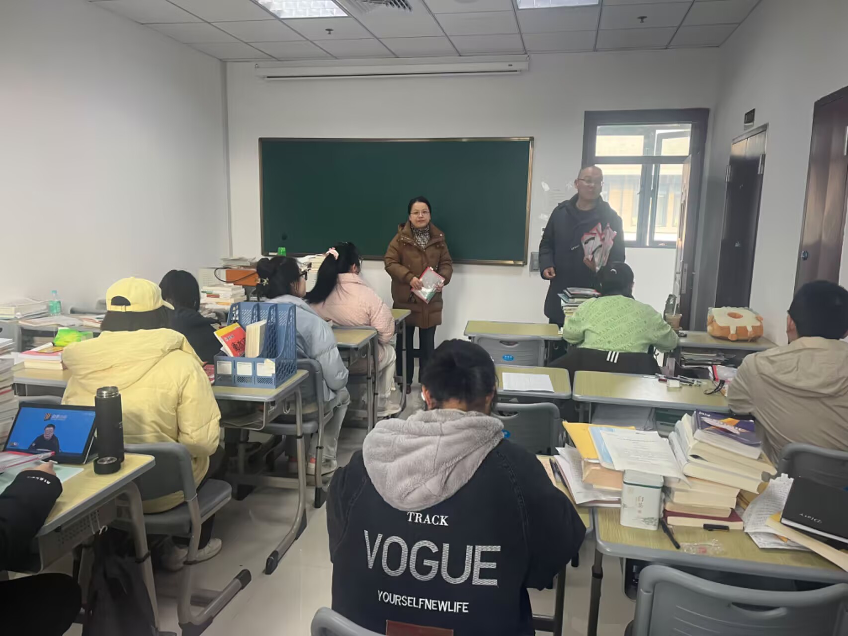 12月5日,法公司党委书记钱敏、副经理崔汪卫带领毕业班辅导员走进公司教室,向正在备战考研的员工送上暖心问候和祝福。