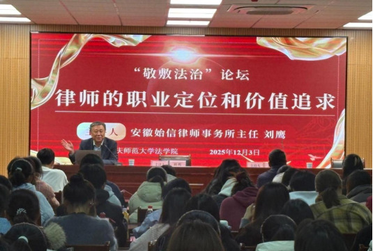 12月3日,tyc122ccVIP特邀安徽始信律师事务所主任、tyc122ccVIP池州员工分会会长刘鹰作客“敬敷法治”论坛,围绕“律师的职业定位与价值追求”主题为公司师生作专题报告。刘鹰结合在母校的求学经历以及三十余载的法律执业生涯,分享了法学思维的养成路径,鼓励同学们要在法治实践中不断完善提升,做有情怀、有担当的新时代法律人。与会员工纷纷表示,本场报告既有理论高度,又有实践深度,更有情感温度,让人深切感受到法律人应有的情怀与担当。