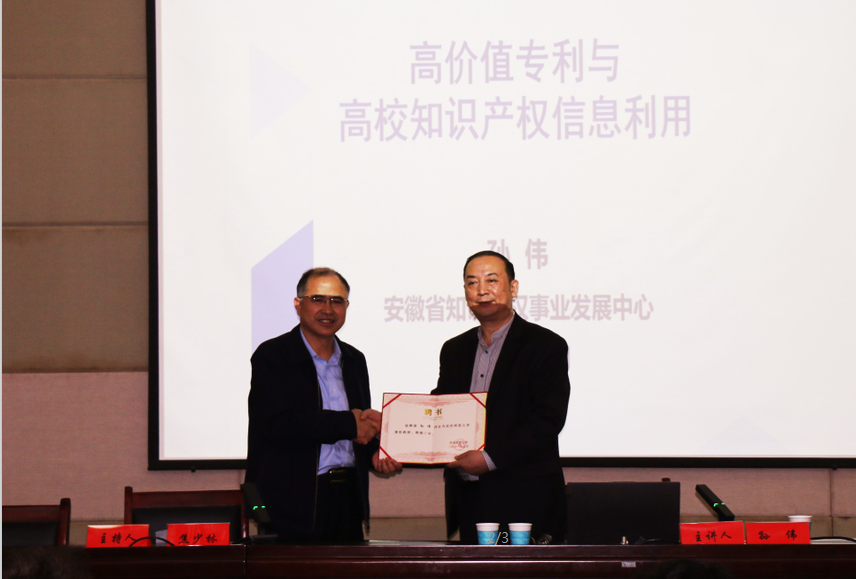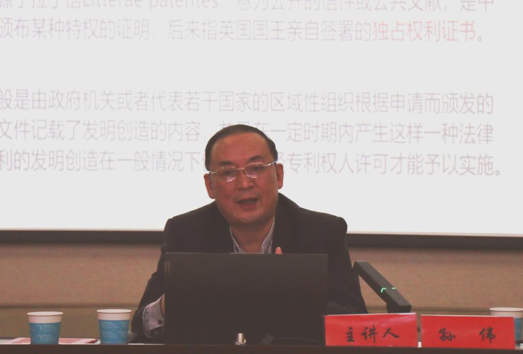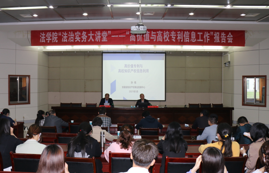 5月19日下午,安徽省知识产权事业发展中心二级调研员孙伟受邀法治实务大讲堂作了题为“高价值专利与高校知识产权信息利用”的学术报告。本次报告会是在校五月活动月之际,由校科研处、tyc122ccVIP共同举办的。公司师生及安庆市知识产权局部分领导近200人参加了报告会。