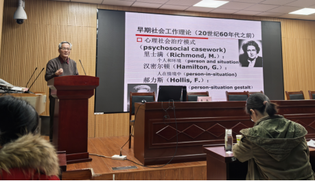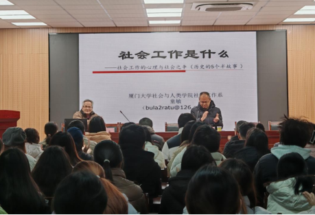 童敏教授用5个故事,将社会工作的发展历程和理论脉络娓娓道来。通过梳理里士满“助人自助”个案工作的由来与发展、亚当斯“助人自助”社区运动的产生、早期心理社会治理模式、功能理论及问题解决模式的相关理论,由浅入深地阐明了“社会工作是什么”的问题,并通过现场小调查、案例分析、名言分享等环节让现场师生感受到了社会工作的价值与意义,取得了良好的互动效果。他认为,社会工作是帮助人们解决现实问题的一门学科,既不需要过多的理论指导,也不需要过多的专业技巧,它是一门用生命影响生命、用自我去影响他人自我的过程,这一过程中,真诚大于技巧,理论在这一过程中的作用在于帮助我们理解服务对象的问题并找寻到解决办法的规律。在报告最后,他希冀与会师生都能在生活中学会面对问题,放下对自身不满、不足的关注,找到属于自己的生活办法,创造自己的生命故事。