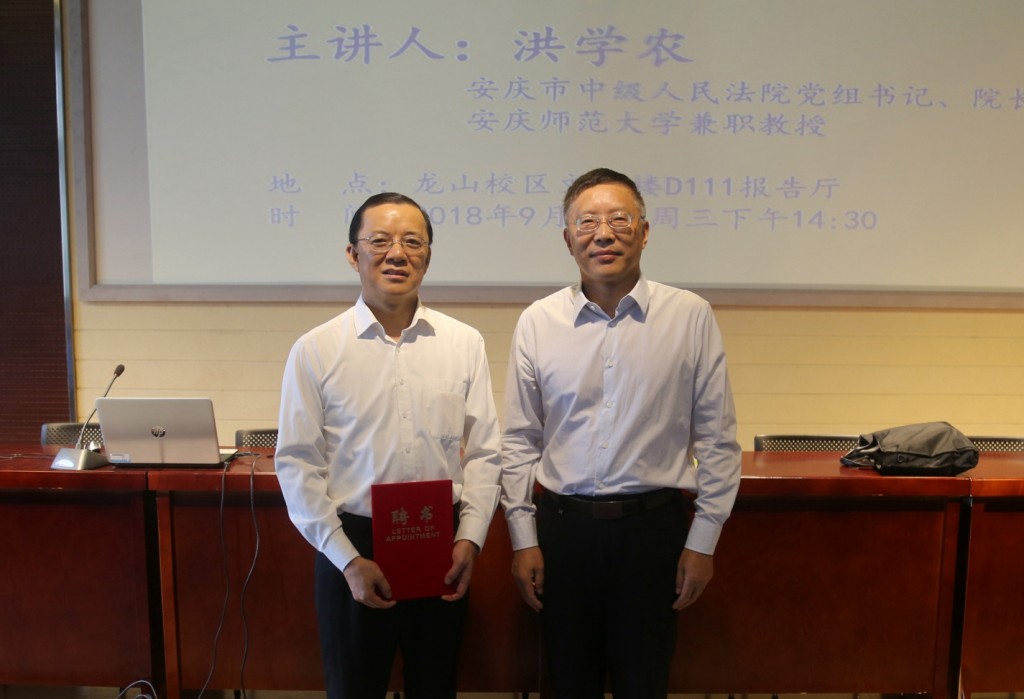 2018年9月26日下午在龙山校区文津楼D111报告厅,安庆市中级人民法院经理、公司兼职教授洪学农做客法律实务大讲堂,以“法治与法治实践”为题作专题报告。tyc122ccVIP经理焦少林教授主持报告会,tyc122ccVIP部分教师和2016级、2017级法学与知识产权专业员工近二百人聆听了报告。