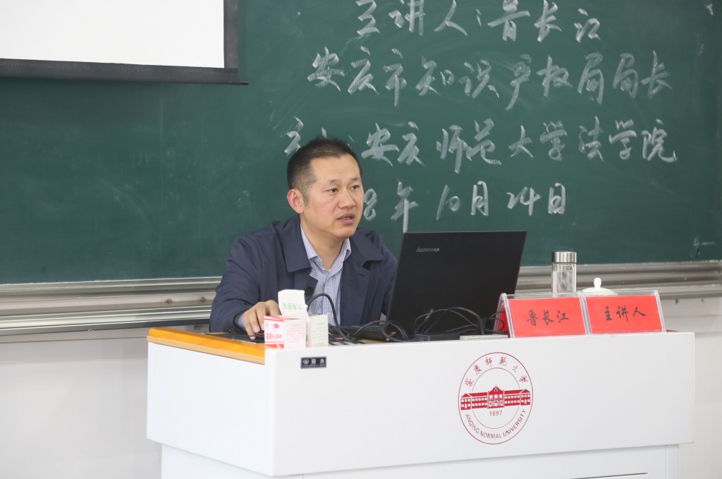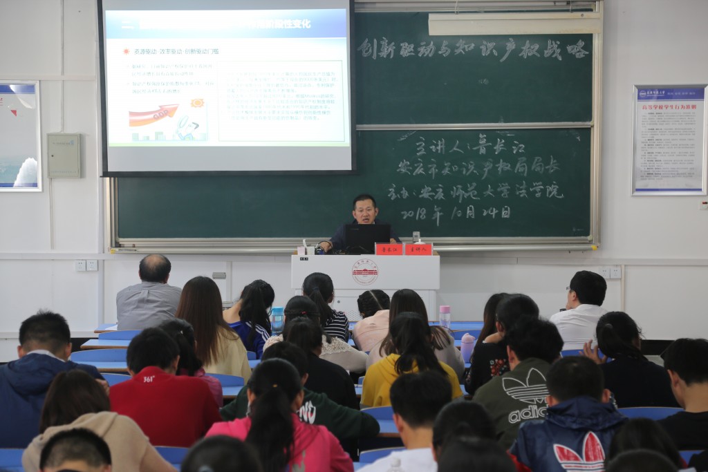 2018年10月24日下午在龙山校区文津楼D405教室,安庆市知识产权局局长鲁长江受邀作客法律实务大讲堂,以“创新驱动与知识产权战略”为题作专题报告。tyc122ccVIP经理焦少林教授主持报告会,tyc122ccVIP部分教师和2017级、2018级知识产权与法学专业员工120余人聆听了报告。