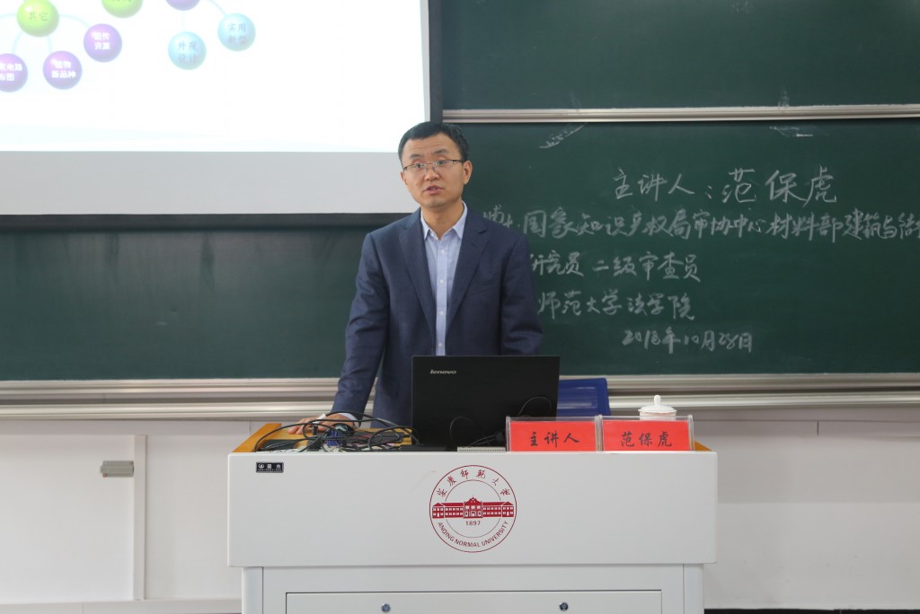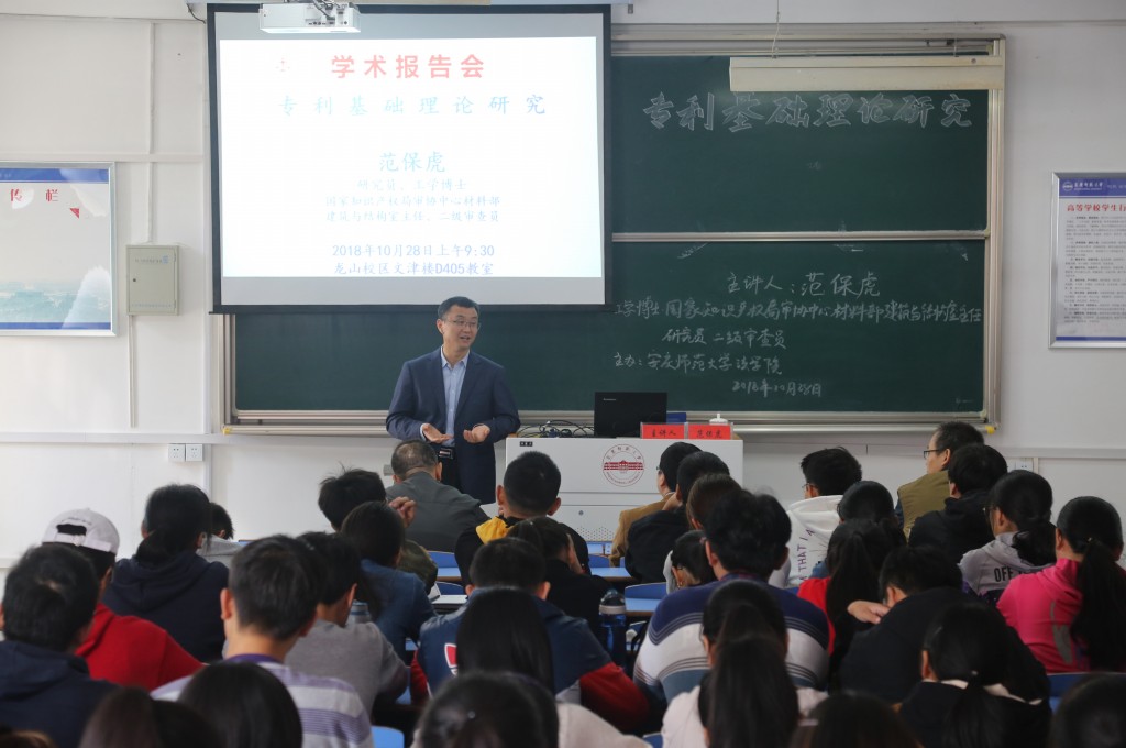 10月28日上午在龙山校区文津楼D405教室,国家知识产权局范保虎研究员应邀来校以“专利基础理论研究”为题作学术报告。tyc122ccVIP副经理朱留虎主持报告会。部分教师和2017级、2018级知识产权专业全体同学和法学专业部分员工共计120余人聆听了报告。