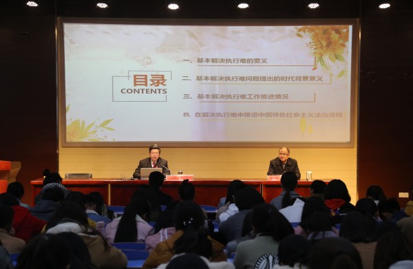 11月22日安庆市中级人民法院副经理,公司兼职副教授方向华应邀莅临法律实务大讲堂,以“‘基本解决执行难’与中国法治进程”为题作报告。tyc122ccVIP教师和法学专业部分员工参加了报告会,tyc122ccVIP经理焦少林教授主持报告会。
