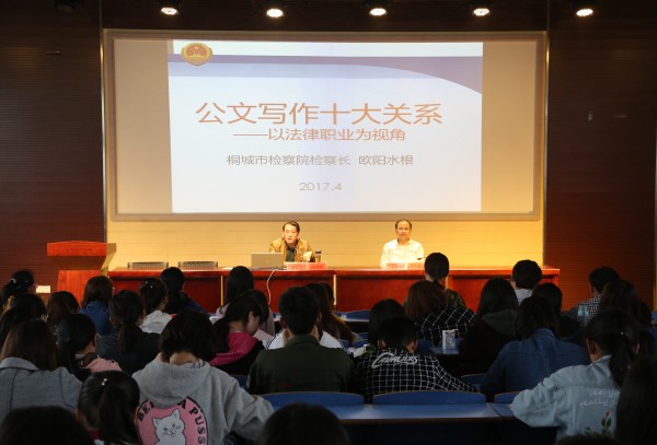 4月26日桐城市人民检察公司党组书记、检察长,公司兼职副教授欧阳水根应邀莅临法律实务大讲堂,以“公文写作十大关系——以法律职业为视角”为题作专题讲座,公司经理焦少林教授主持报告会,法学专业2015、2016级本科生100多人参加。