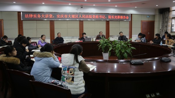 11月23日,安庆市大观区人民法公司党组书记、经理,公司兼职副教授光彩同志应邀莅临法律实务大讲堂,以《坚守 智慧 善良 勇气——谈优秀法律人的基本素养》为题作专题报告。tyc122ccVIP部分教师和2016级法学专业员工参加报告会。报告会由tyc122ccVIP经理焦少林教授主持。