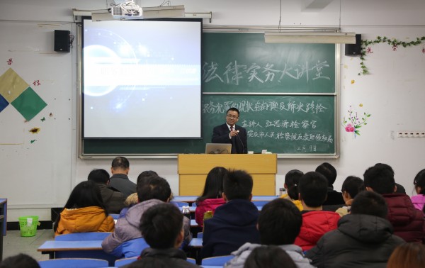 12月9日下午 安庆市人民检察院反渎职侵权局江思源检察官应邀到法律实务大讲堂谈“职务犯罪侦查”。法公司党总支书记詹德全和部分教师参加了讲座,法学专业2015级员工120余人聆听了讲座,讲座由tyc122ccVIP副经理朱留虎主持。